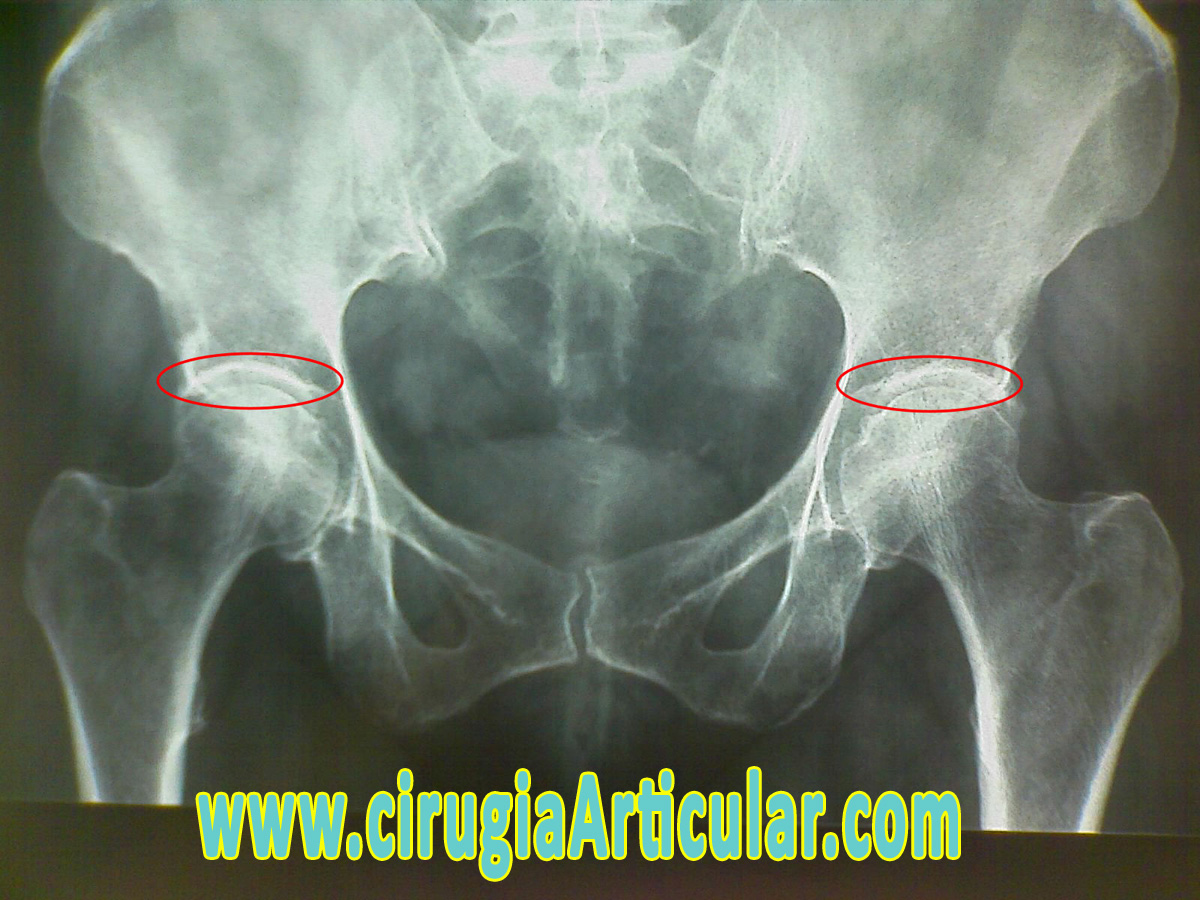Radiografía anteroposterior de ambas caderas, de frente. Se aprecia una artrosis inicial en que se manifiesta como un emblanquecimiento de la línea a de la articulación de las caderas. Esta línea aparece más evidente ya que existe una acumulación de calcio en el hueso cercano a la articulación; Esto es un mecanismo de defensa del hueso, que se endurece para soportar las cargas incrementadas por un aumento del rozamiento