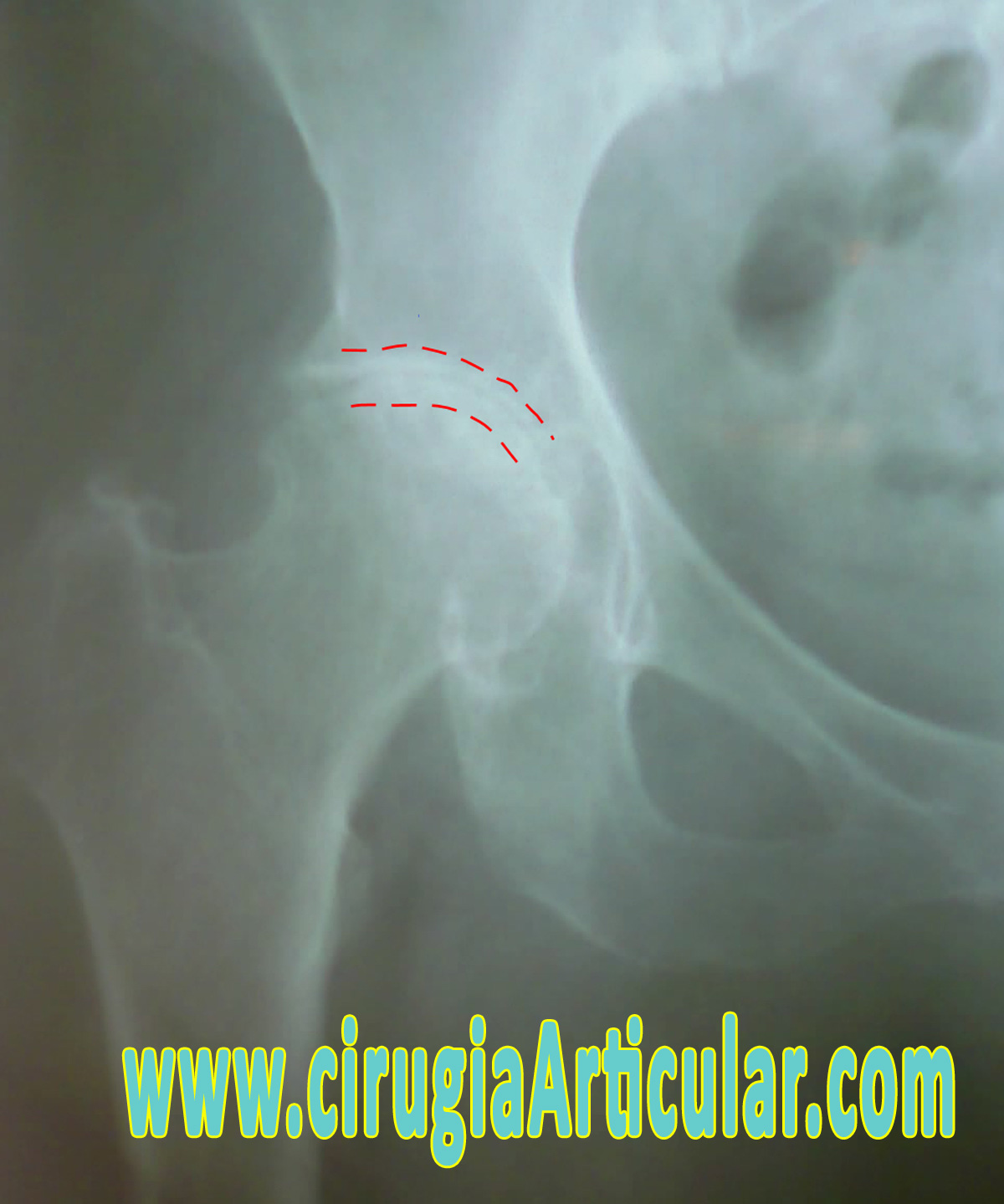 Radiografía anteroposterior de una cadera, de frente. En este caso la destrucción de la articulación es mayor. Se trata de un estadio mas evolucionado de la coxartrosis. Existe un borramiento casi total de la línea articular. Pinzamiento articular (espacio entre las lineas rojas)