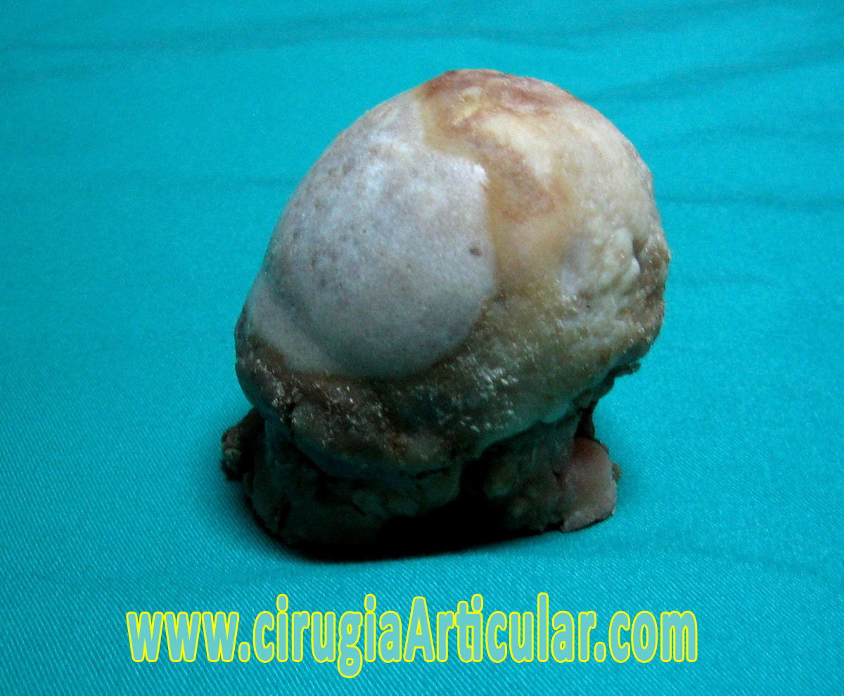 Pieza extraída de un paciente con artrosis de cadera previo a la implantación de una prótesis total de cadera. La superficie de la cabeza del fémur se hace muy rugosa, aumentando la fricción con el movimiento de la articulación.