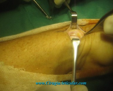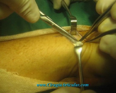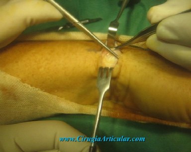 Sección en sentido longitudinal de la envoltura o vaina engrosada de los tendones. De esta manera se abre el túnel por el que pasan, liberándolos de la compresión a la que están sometidos por parte de su envoltura.