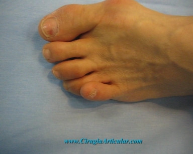 En la fotografÃa podemos observar el detalle de la deformidad. La punta del quinto dedo se orienta hacia dentro (quintus varus) y se superpone al 4º dedo (supraductus)