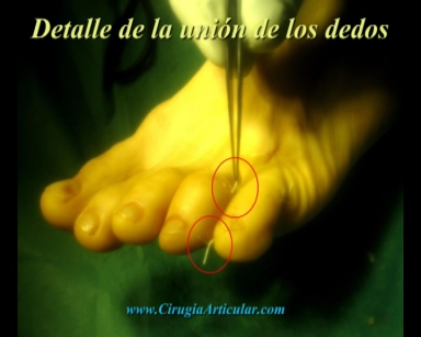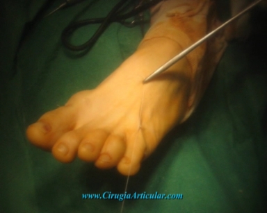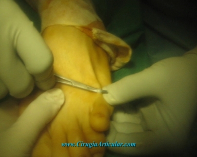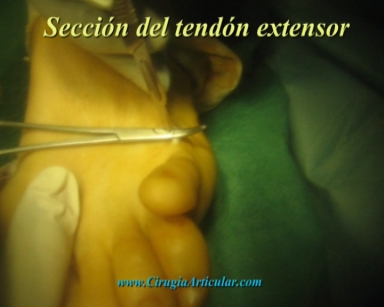 Se secciona con un bisturà el tendón extensor. Este tendón fija y mantiene la deformidad junto a la capsula o envoltura de la articulación.